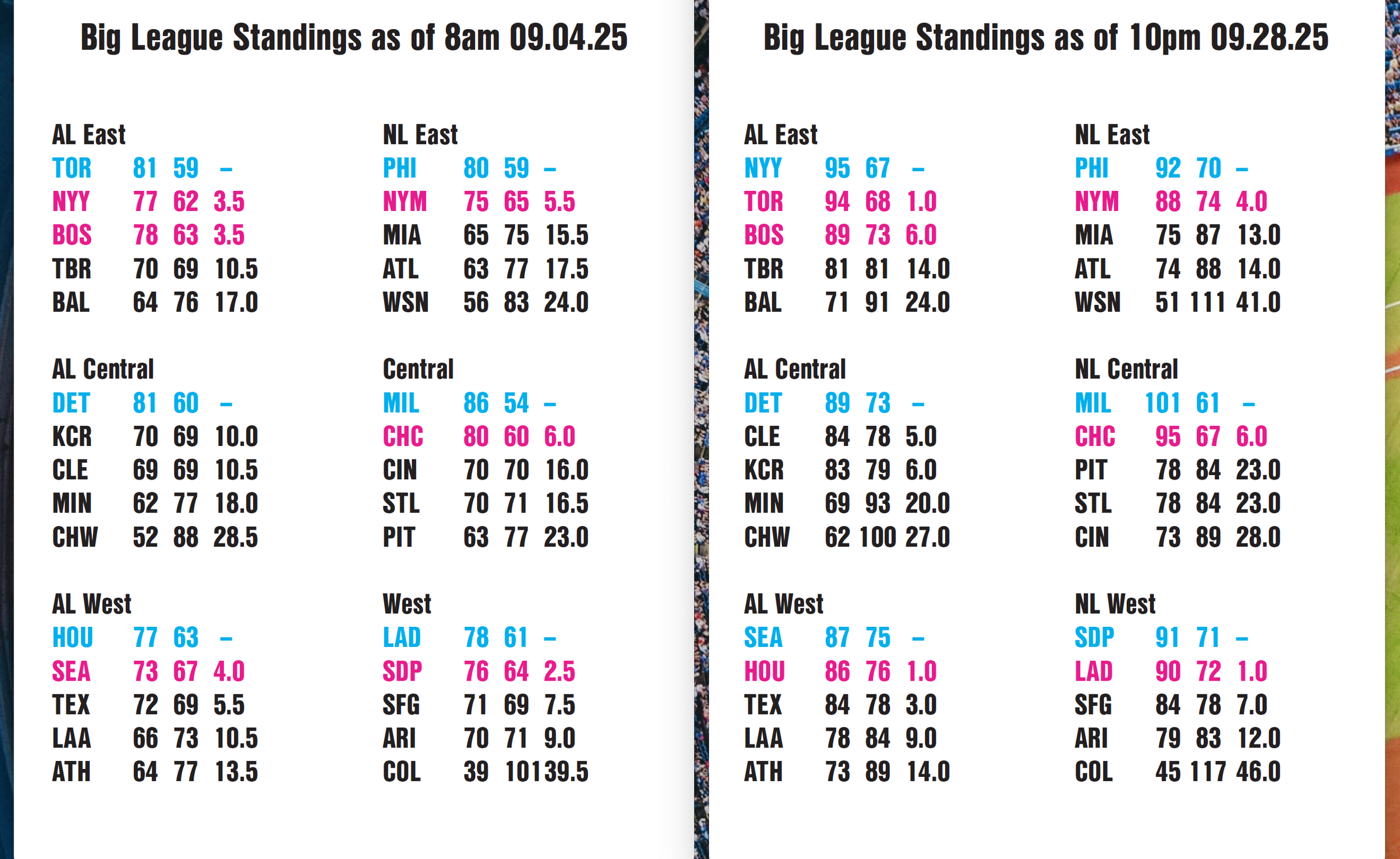 In anticipation of the event we, of course, had to fast-forward the 2025 regular season to its conclusion to see who made the playoffs. (In recent seasons, we've begun this project after the real-life regular season had concluded, plugging in the actual playoff teams and starting the "pre-PLAAY" with the Wild Card round. Prior to COVID, though, we would "fast forward" the regular season starting in early-to-mid September and determine our OWN playoff field!) We did this by using the HMB "Instant Results" chart to determine the winner for every game on the schedule, from September 4th through the 28th (this took about an hour to do). Here's a side-by-side comparison of what the standings were when we started rolling (8am 09.04.25) and how they ended up. Division leaders are highlighted in blue, wild card teams are highlighted in magenta...