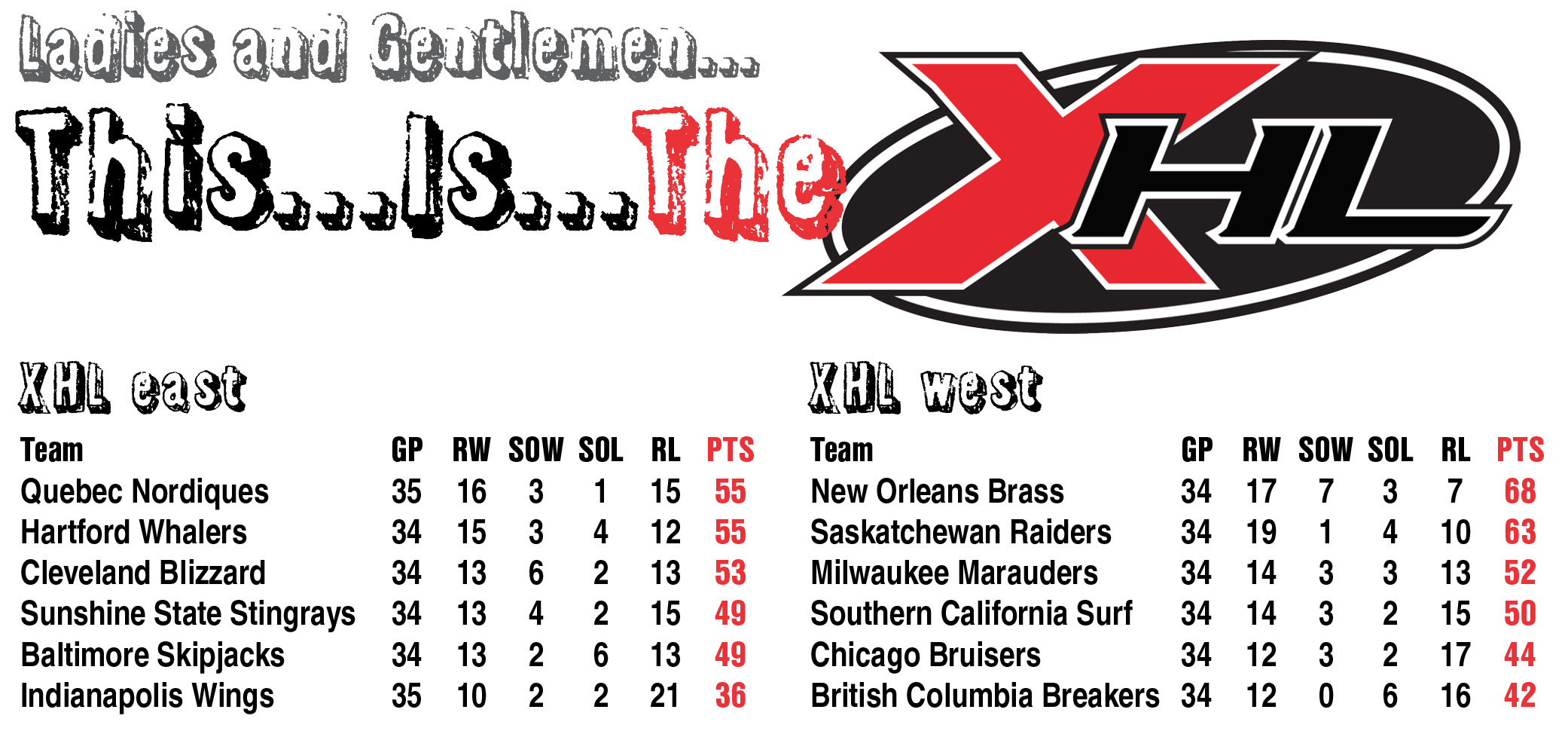 I know there are a good number of solo and co-op projects happening in the PLAAY Community, but since I am playing in this one (in charge of the British Columbia Breakers) I thought I'd give a shout out. Derek Jones (commissioner) and all of the other coaches have done a tremendous job of keeping our XHL season project on-track for what looks to be a classic "fantastic finish." Here are the standings through the end of January. Who'll win the east is anyone's guess, while the New Orleans Brass and Saskatchewan Prairie Raider are the "best-of-the-west!" We even had our own XHL version of the "Winter Series" (outdoors) Baltimore and Hartford! Well done, everyone!