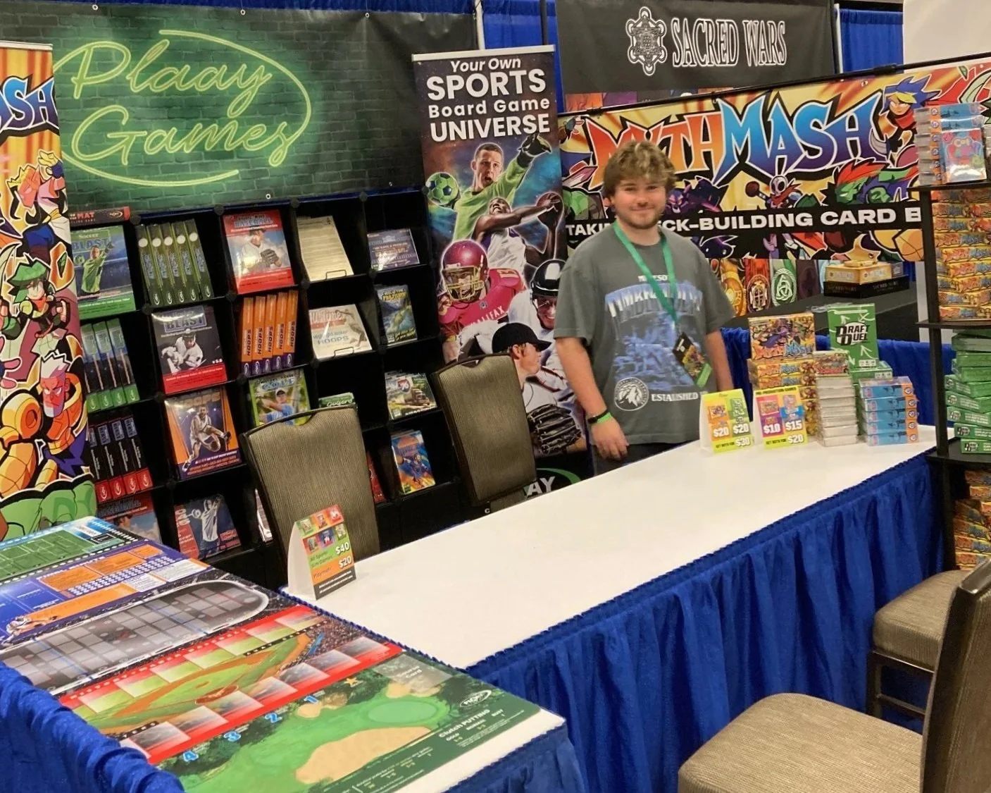 Here’s Sam, manning the booth on “opening day” (for exhibitors) at BGG.con, Thursday 11.19.25.