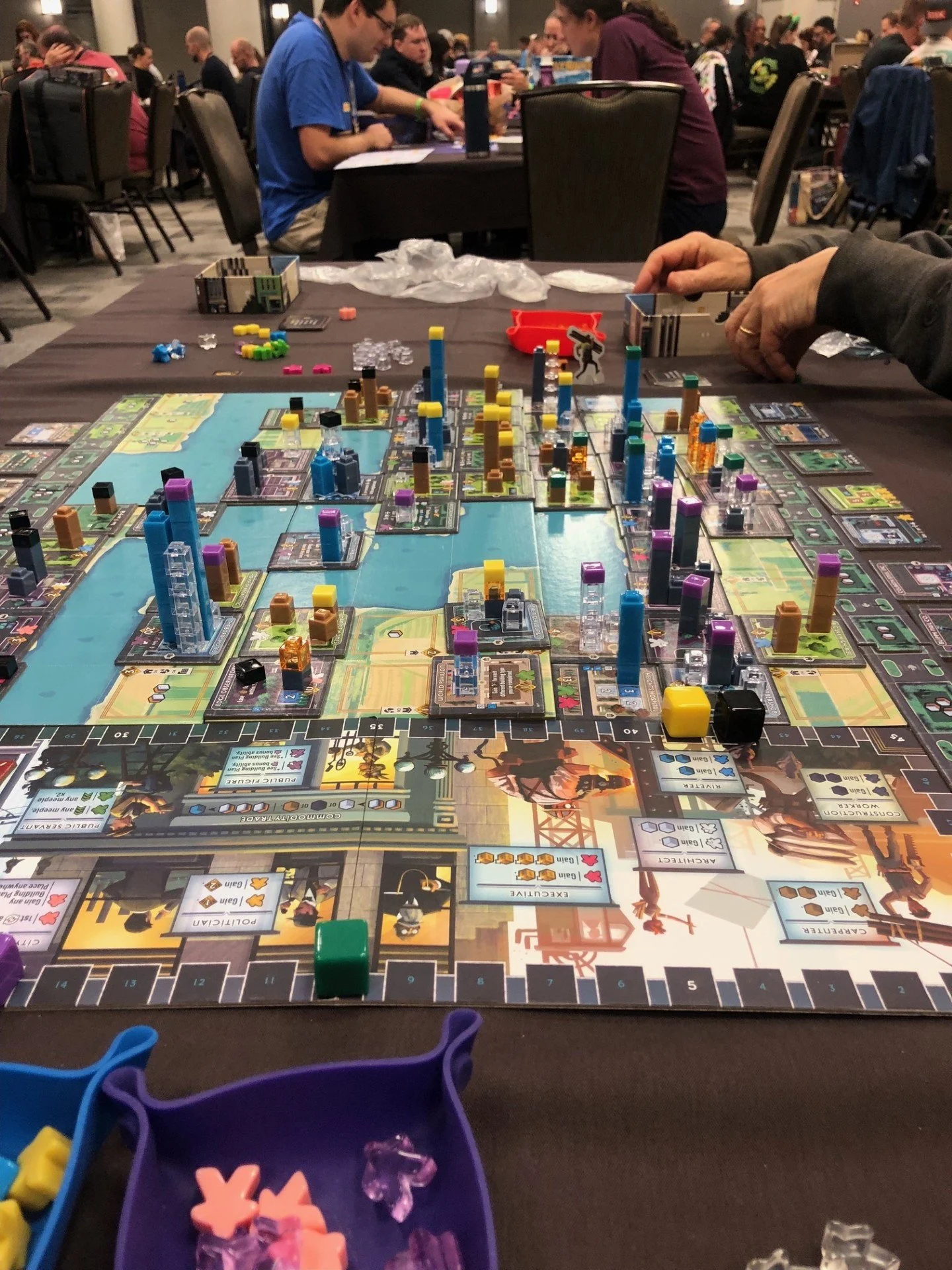 Despite being busy all day at the exhibitors hall, we still had/made time for some after-hours gaming. BGG.con has a similar expansive game library as Dice Tower West. "After hours" gaming included Unmatched, a "street fighting" game (I was Bigfoot, Joseph was Robin Hood) and a VERY cool resource management game called Rolling Heights. (I finished in last place, but I did build a very cool sports stadium!).