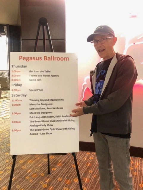 Saturday afternoon both Sam and I participated in BGG's Game Designer Panel. Sam's slot was 1 to 2:30 with fellow (young) designer Reed Ambrose. Mine was at 3pm with (um, "veteran") game designers Alan Moon and Eric Lang. Honestly, I felt a little out of my element. But I will conceded that I have approached the game business/hobby from an angle dramatically different than the norm. So, if nothing else, I did feel like I brought a unique perspective. The discussion was wide-ranging, from game favorites to design tips to the impact of AI on board games. After the discussion included, I had discussions with a couple of the audience members who were unfamiliar with the sports sim game genre. SO interesting the different perspectives!
